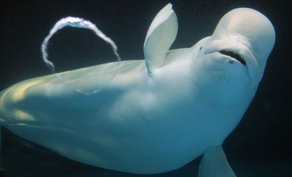 可爱的小白鲸水下吹泡泡自娱自乐(图)